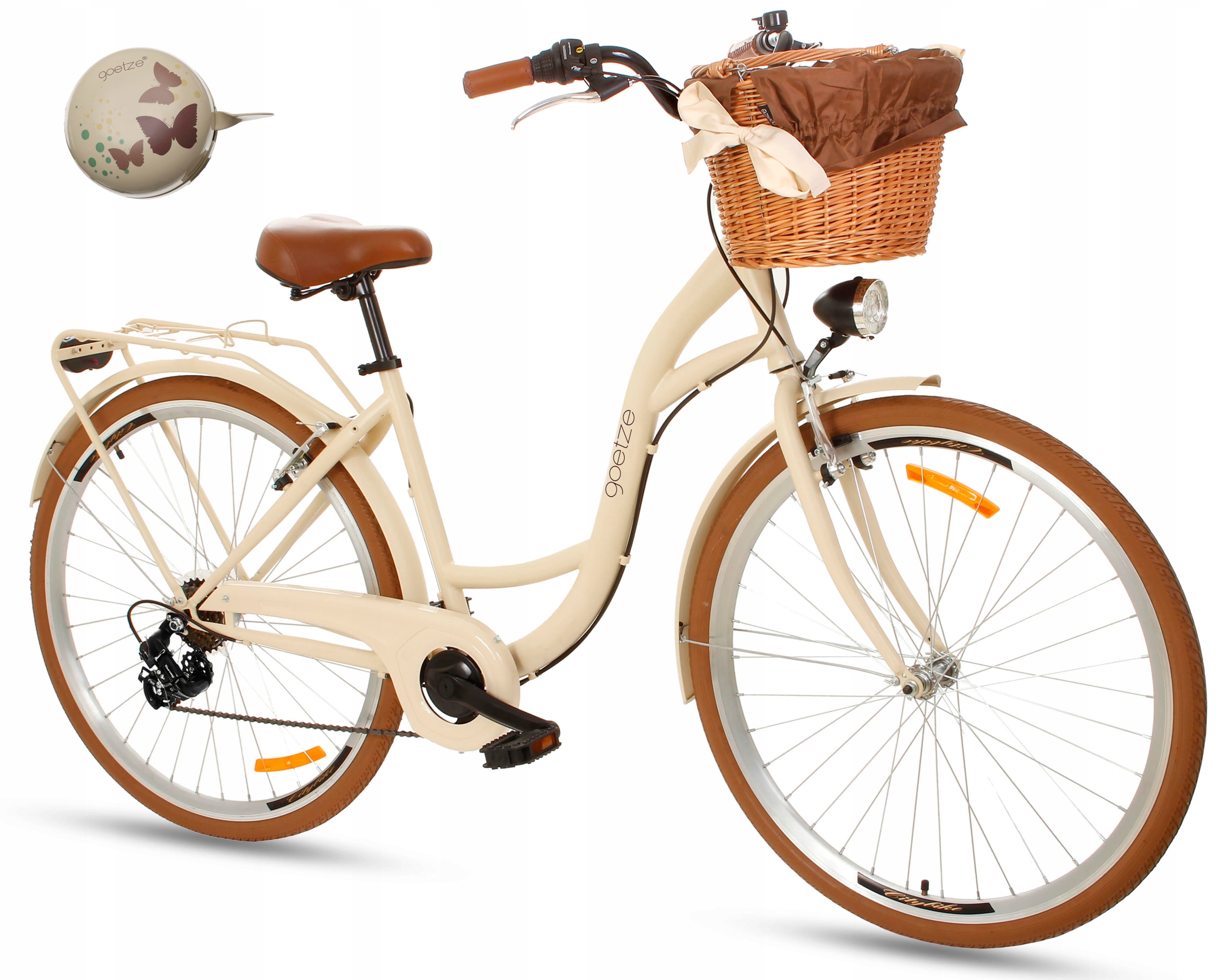 UWAGA: w tej ofercie do zakupionego roweru poza wiklinowym koszem z wkładem otrzymasz duży stylowy dzwonek Goetze o średnicy 80mm, świetnie pasujący do charakteru roweru.